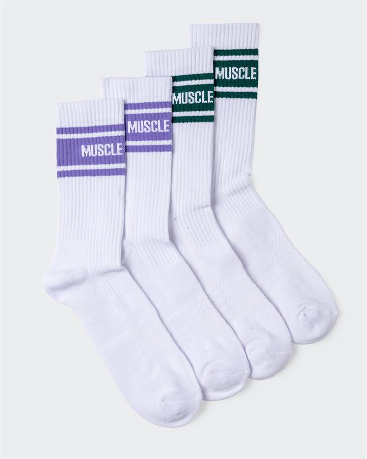 – Mens one size fits all- Crew length- Muscle Nation stripe jacquard logo on top edge- 2 pack (White/Antique Green & White/Aster Purple)- 80% Cotton, 15% Polyester, 5% Spandex