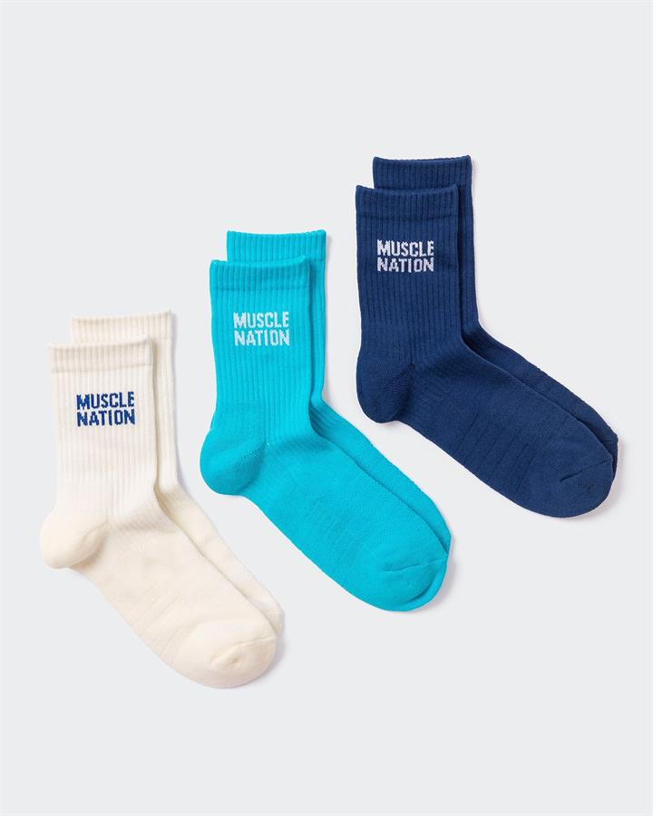 – Womens one size fits all- Crew length- Muscle Nation jacquard logo – 3 pack Navy / Hawaiian Blue / Off White- 80% Cotton, 15% Polyester, 5% Spandex